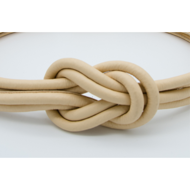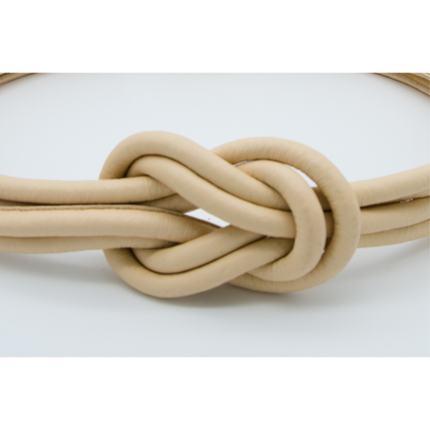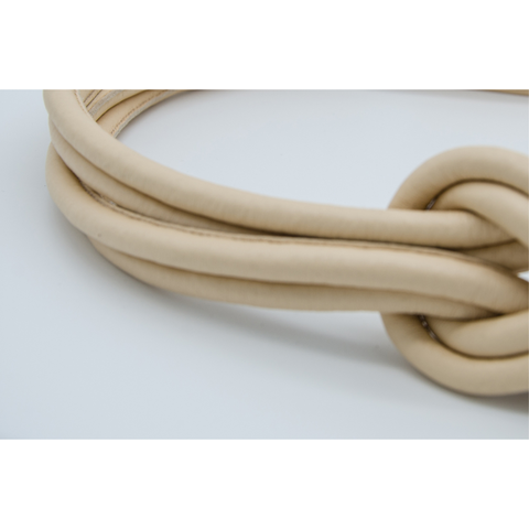 Cinto trenzado de cuero de oveja 100% en color beige, con tres cuerdas y nudo central.