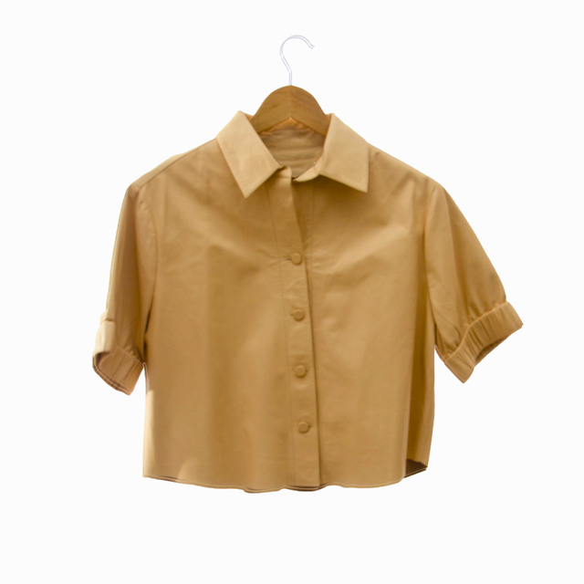 Conjunto de cuero de oveja 100% en color beige. Incluye pantalón de tiro alto, corte semi oxford, con cierre y botón forrado, y chaqueta de tiro corto con mangas fruncidas y botones forrados.